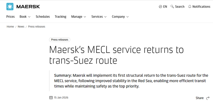 馬士基在聲明中指出:“這一決定基于紅海及蘇伊士航道周邊局勢的持續(xù)穩(wěn)定,包括該地區(qū)整體安全性、航運環(huán)境的穩(wěn)定性和可靠性的改善。”